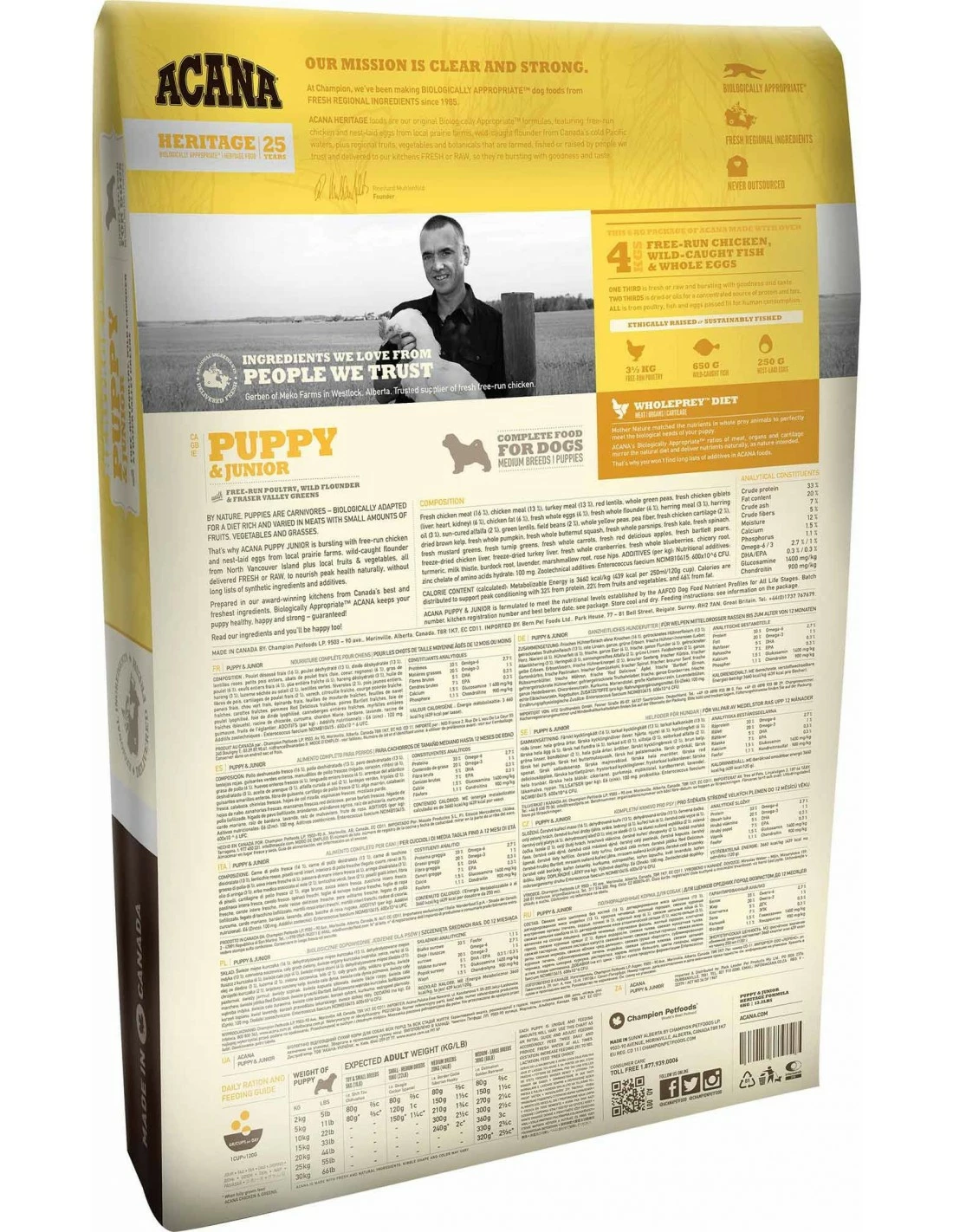 Per questo motivo ACANA Puppy & Junior è ricco di pollo allevato a terra, platessa pescata in natura e uova deposte in nido, consegnati FRESCHI nelle proporzioni della preda intera (WholePrey), così da essere ricchi di bontà e gusto.