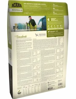 La ricetta di ACANA Grasslands si ispira alle vaste praterie e laghi del nord del Canada Meridionale (zona definita Grasslands per la prevalenza di erbe spontanee e l’assenza di boschi): per questo contiene agnello fresco, anatra allevata a terra, uova intere deposte in nido, luccio del nord pescato in natura e tacchino allevato a terra.