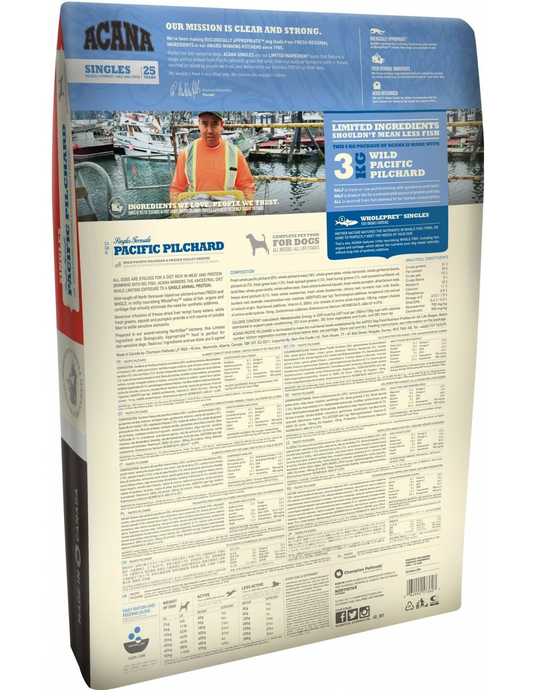 Acana Singles Pacific Pilchard in particolare contiene il 50% di Sardine, pescate in natura. Una sola fonte proteica animale facilmente digeribile, che viene preparata nelle ricche e nutrienti proporzioni della preda intera (WholePrey), che comprendono pesce, organi e cartilagine, rispecchiando la dieta naturale del cane. Per completare la formulazione, cavolo, spinaci e zucca, che stimolano una sana digestione, apportando inoltre il giusto equilibrio di vitamine e sali minerali.
