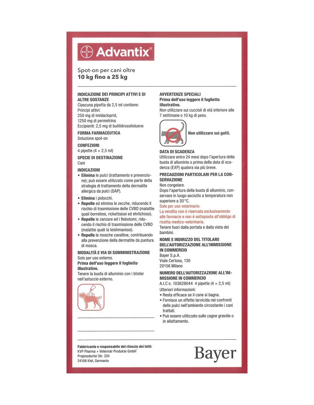 Bayer Advantix Spot-on Per Cani Da 10 A 25 Kg – 4 Pipette X 2,5 Ml