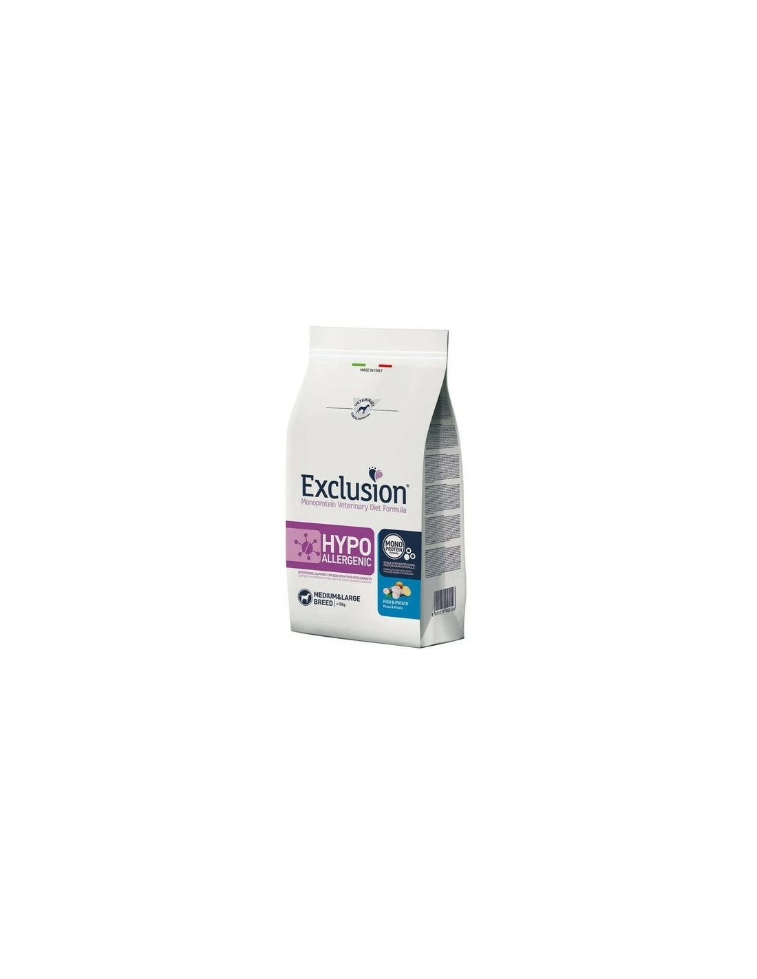 Exclusion Monoprotein Veterinary Diet Formula Hypoallergenic è un alimento dietetico con formulazione monoproteica, realizzato con un’unica fonte alternativa di proteine animali, ingredienti innovativi e preservato con tocoferoli naturali; rappresenta la risposta nutrizionale a disposizione del Veterinario, differenziata per taglia, come supporto nutrizionale per cani con intolleranze alimentari.