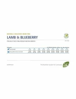 Agnello fresco disossato (26%), carne di agnello disidratata (25%), patate, uova intere disidratate, aringhe fresche, aringhe disidratate, grasso animale, olio di pesce, fibra vegetale di pisello, carote essiccate, farina d´erba medica disidratata, inulina, fruttoligosaccaridi, mannanoligosaccaridi, mirtilli in polvere (0.5%), mela disidratata, melograna in polvere, arancia dolce disidratata, spinaci in polvere, psyllium (0.3%), ribes in polvere, cloruro di sodio, lieviti di birra essiccati, radice di curcuma (0.2%), glucosamina, condroitinsolfato, estratto di fiore di Tagete (fonte di luteina).