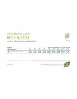 Cinghiale fresco disossato (22%), carne di cinghiale disidratata (20%), patate, pollo fresco disossato, carne di pollo disidratata, grasso di pollo, uova intere disidratate, pesce disidratato, olio di pesce, fibra vegetale di pisello, carote essiccate, farina d´erba medica disidratata, inulina, fruttoligosaccaridi, mannanoligosaccaridi, mela disidratata (0.5%), melograna in polvere, arancia dolce disidratata, spinaci in polvere, psyllium (0.3%), ribes in polvere (0.3%), mirtilli in polvere, cloruro di sodio, lieviti di birra essiccati, radice di curcuma (0.2%), glucosamina, condroitinsolfato, estratto di fiore di Tagete (fonte di luteina).