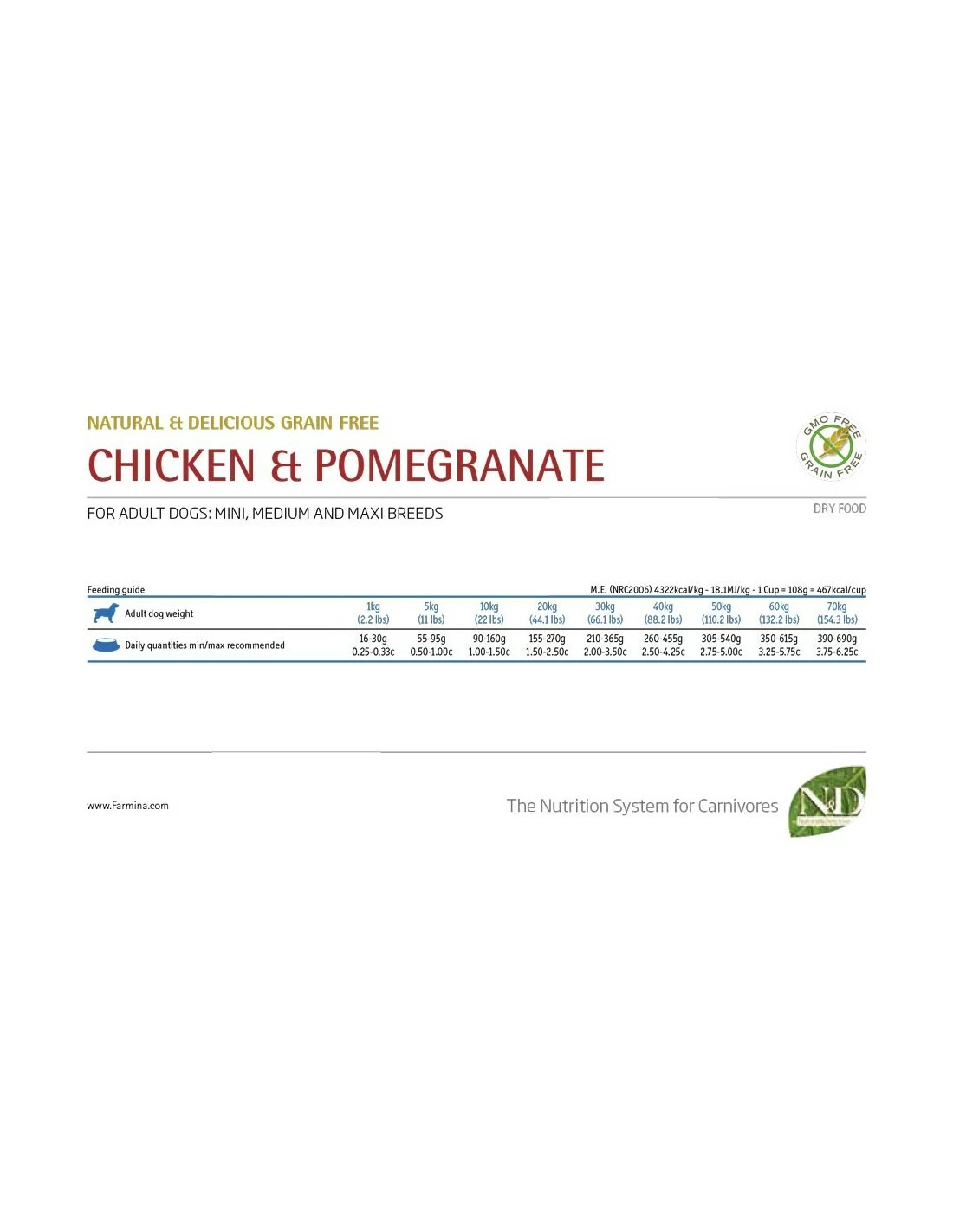 Pollo fresco disossato (26%), carne di pollo disidratata (25%), patate, grasso di pollo, uova intere disidratate, aringhe fresche, aringhe disidratate, olio di pesce, fibra vegetale di pisello, carote essiccate, farina d´erba medica disidratata, inulina, fruttoligosaccaridi, mannanoligosaccaridi, melograna in polvere (0.5%), mela disidratata, spinaci in polvere, psyllium (0.3%), ribes in polvere, arancia dolce disidratata, mirtilli in polvere, cloruro di sodio, lieviti di birra essiccati, radice di curcuma (0.2%), glucosamina, condroitinsolfato, estratto di fiore di Tagete (fonte di luteina).