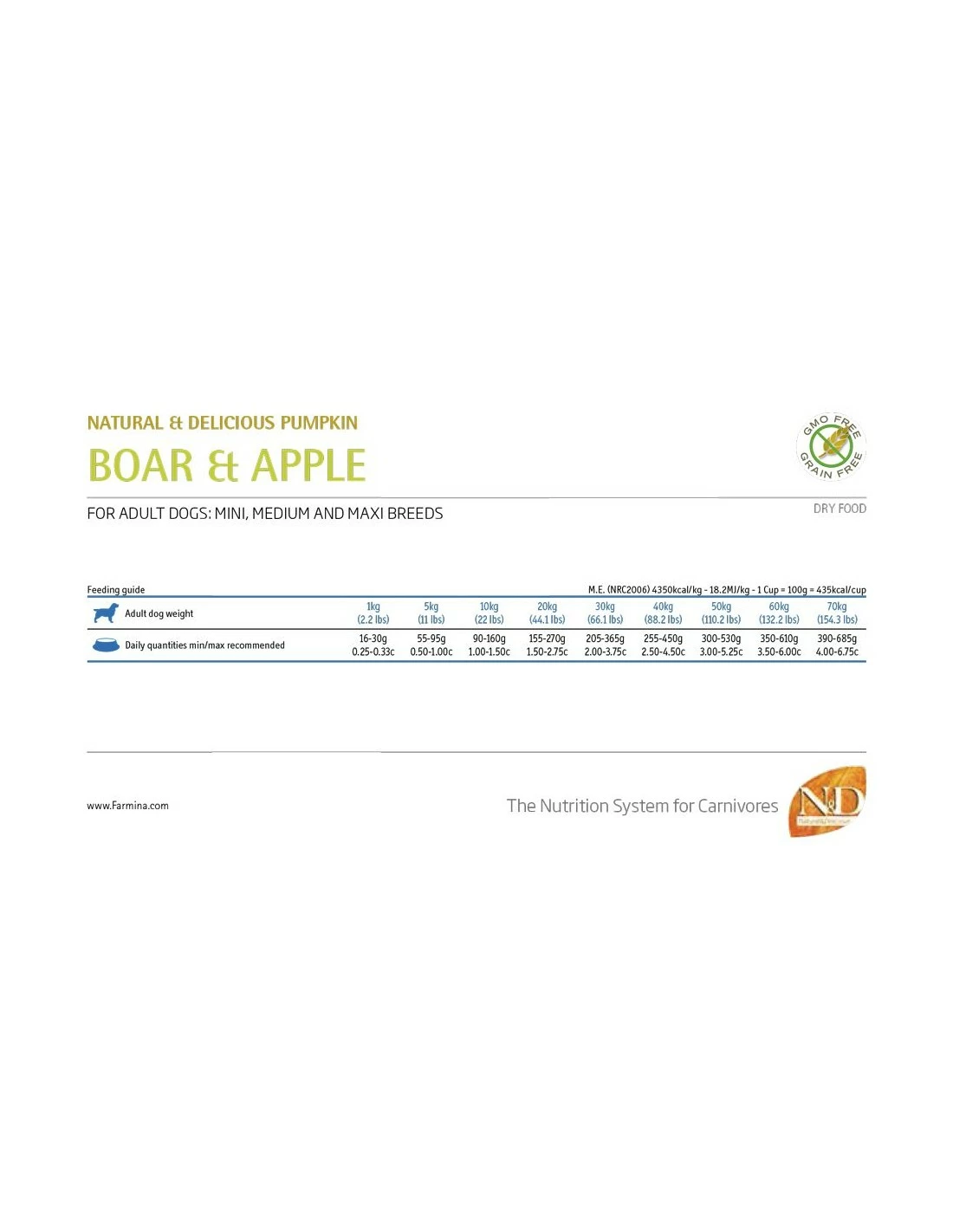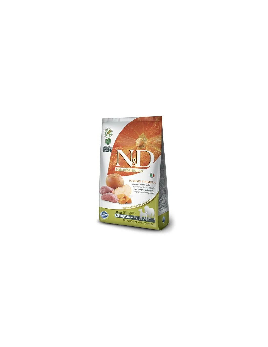 Cinghiale fresco disossato (24%), carne di cinghiale disidratata (22%), amido di pisello (20%), grasso di pollo, zucca disidratata (5%), uova intere disidratate, olio di pesce, fibra vegetale di pisello, carote essiccate, farina d’erba medica disidratata, inulina, fruttoligosaccaridi, mannanoligosaccaridi, mela disidratata (0.5%), spinaci in polvere, psyllium (0.3%), melagrana in polvere, ribes in polvere, arancia dolce disidratata, mirtilli in polvere, cloruro di sodio, lievito di birra essiccato, radice di curcuma (0.2%), glucosamina, condroitinsolfato, estratto di fiore di Tagete (fonte di luteina).