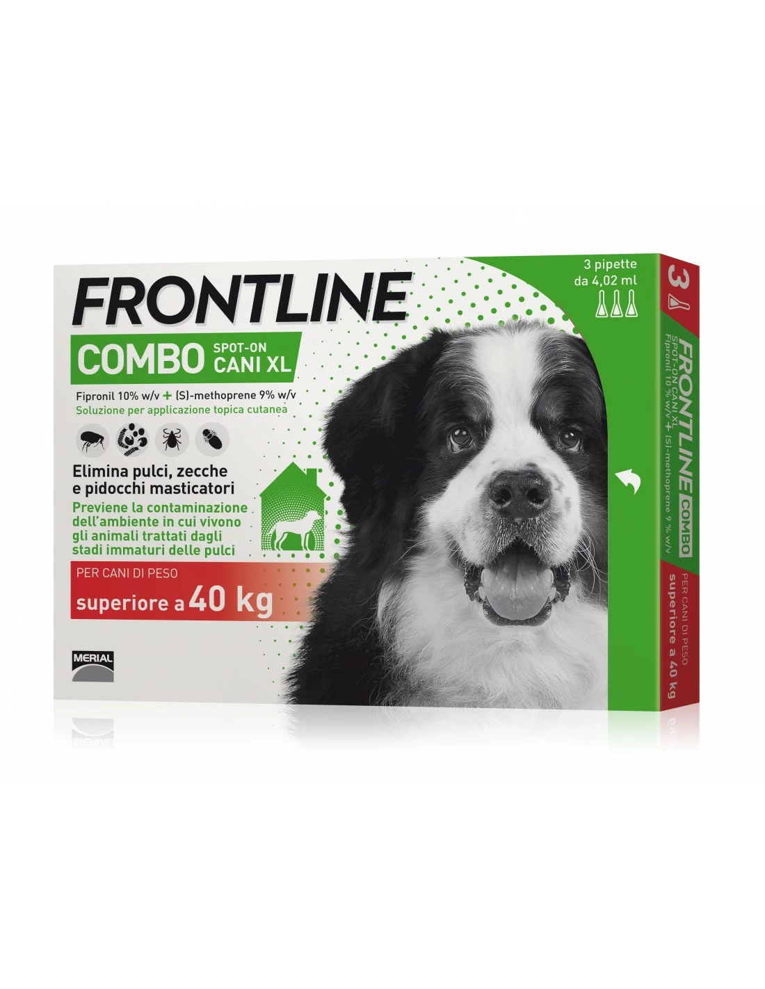 Frontline Combo è un efficace antiparassitario in tre pipette (da 4,02 ml) per cani di peso oltre i 40 Kg. Fipronil e S-Methoprene garantiscono una protezione ottimale contro pulci, zecche e pidocchi. Frontline Combo elimina i parassiti e protegge il cane da eventuali reinfestazioni per circa due mesi. A differenza del Frontline tradizionale, la sua azione blocca lo sviluppo delle uova, delle larve e delle pupe delle pulci, prevenendo così la contaminazione dell’ambiente in cui vive il cane. E’ particolarmente indicato nei soggetti che trascorrono la maggior parte del tempo in casa. Il prodotto è utilizzabile anche in periodo di gravidanza e allattamento o inserito nel programma di controllo della dermatite allergica da pulce (DAP).