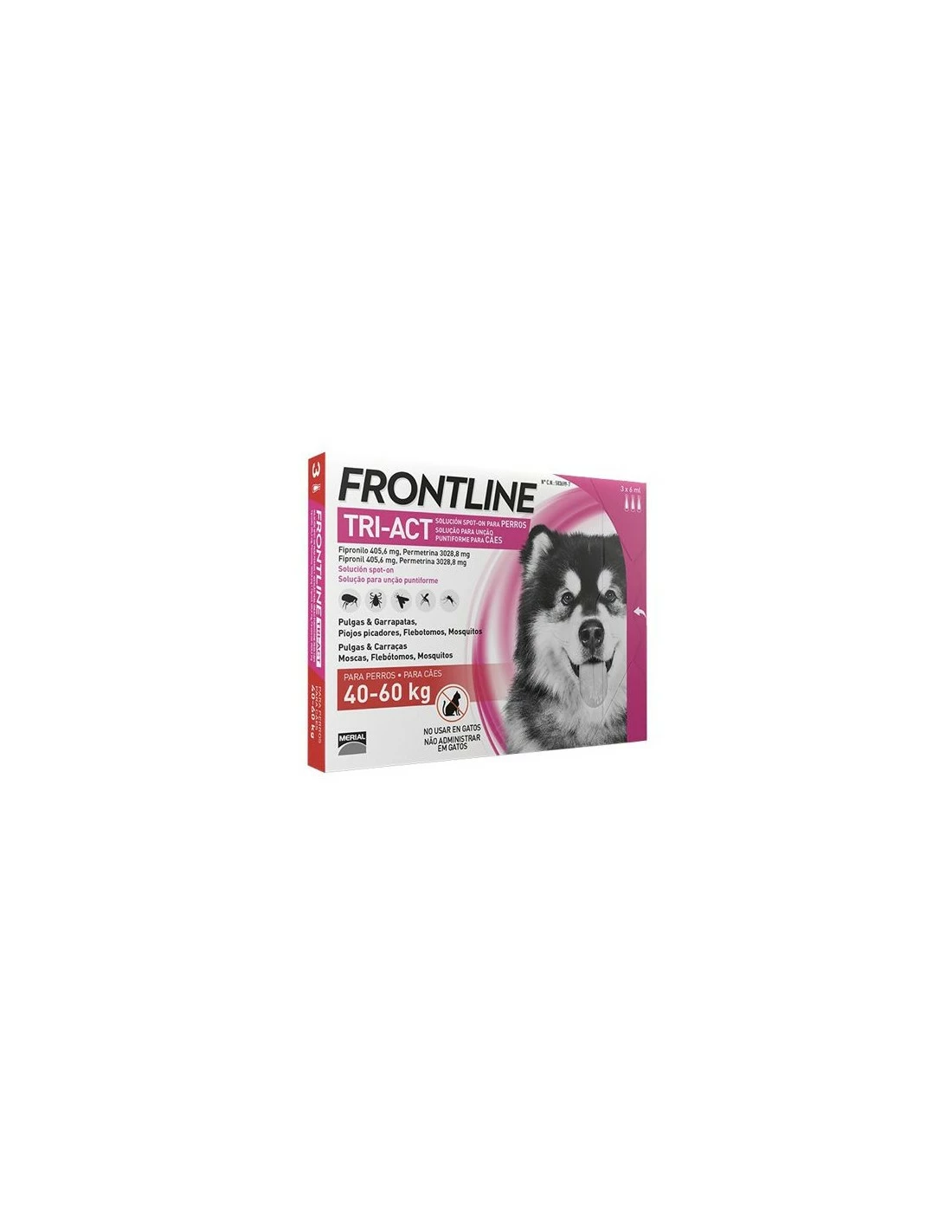 Caratteristiche del prodotto: associa due principi attivi di riferimento: fipronil + permetrina; nuova pipetta a facile svuotamento; prodotto da applicare in due punti: base testa e base del collo; per cani dalle 8 settimane d’età e/o con peso a partire dai 2 kg; protegge il cane dalla Leishmaniosi e da altre malattie dovute ai parassiti grazie all’effetto repellente. Frontline Tri-act è utile per combattere: pulci, con una prevenzione delle infestazioni per 4 settimane, zecche, acaricida per 4 settimane, lebotomi, la permetrina presente nel prodotto fornisce attività repellente anch’essa per 4 settimane; il prodotto inoltre offre un’attività insetticida per tre settimane, repellente contro le zanzare per 4 settimane e repelle ed elimina, sempre in 4 settimane, le mosche.
