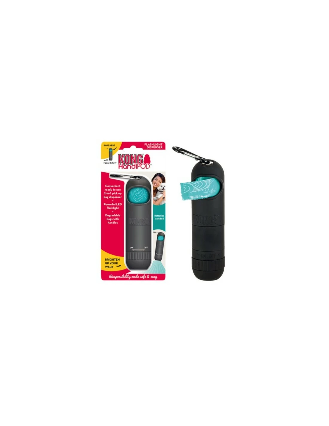 KONG Handipod è un pratico dispenser di sacchetti igienici, con una torcia al led incorporata; è progettato per i proprietari responsabili, che vogliono portare a spasso il loro amico a quattro zampe giorno e notte.
