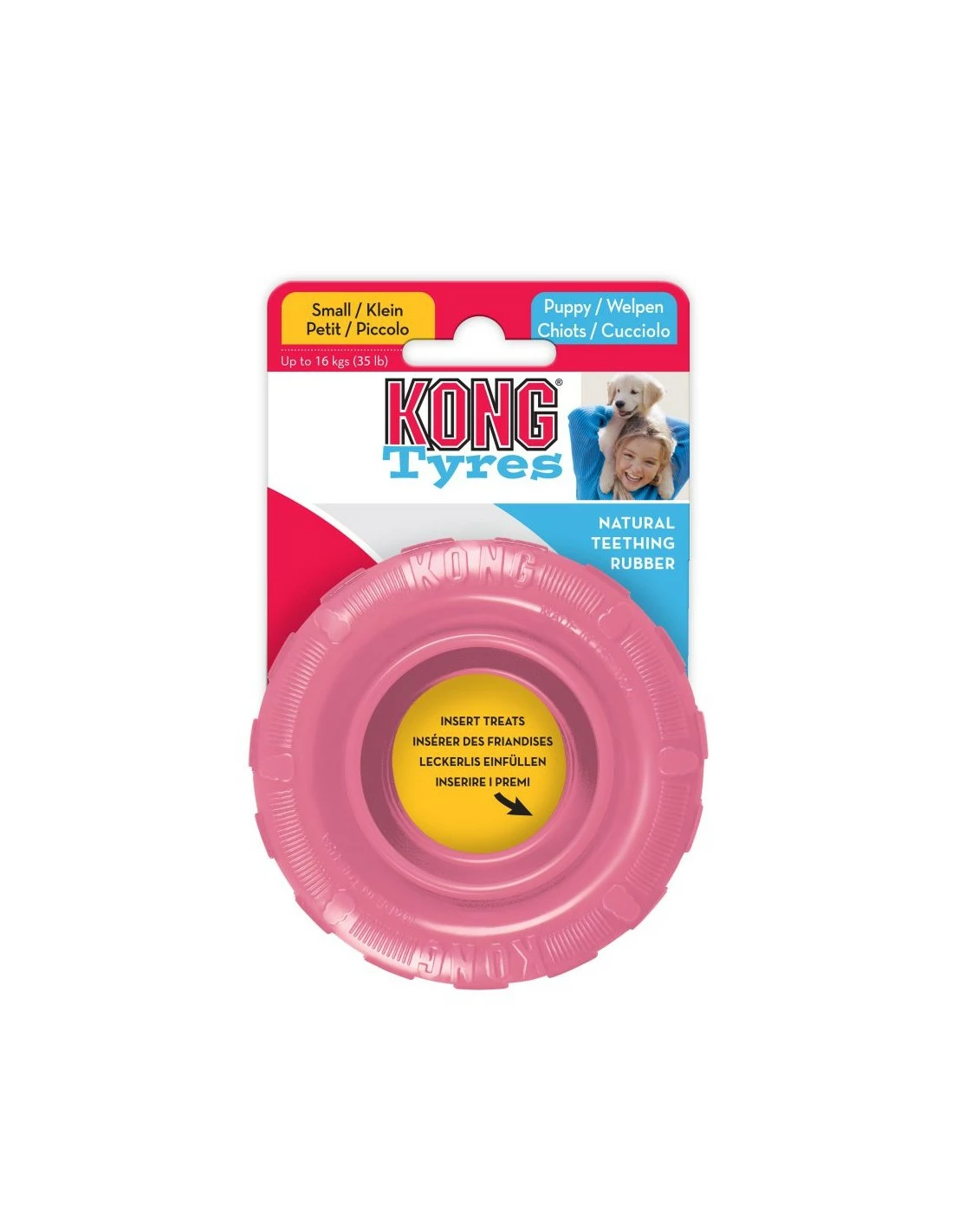 KONG Puppy Tyres è un nuovo gioco della famosissima linea di prodotti KONG Classic Puppy. Ispirato al successo dei popolari KONG Tyres per cani adulti, questo giocattolo utilizza l’esclusiva gomma morbida per cuccioli, studiata appositamente per lenire il fastidio alle gengive durante la dentizione. La pista interna riempibile crea una sfida mentale per i cuccioli, insegnando nel contempo una corretta masticazione.