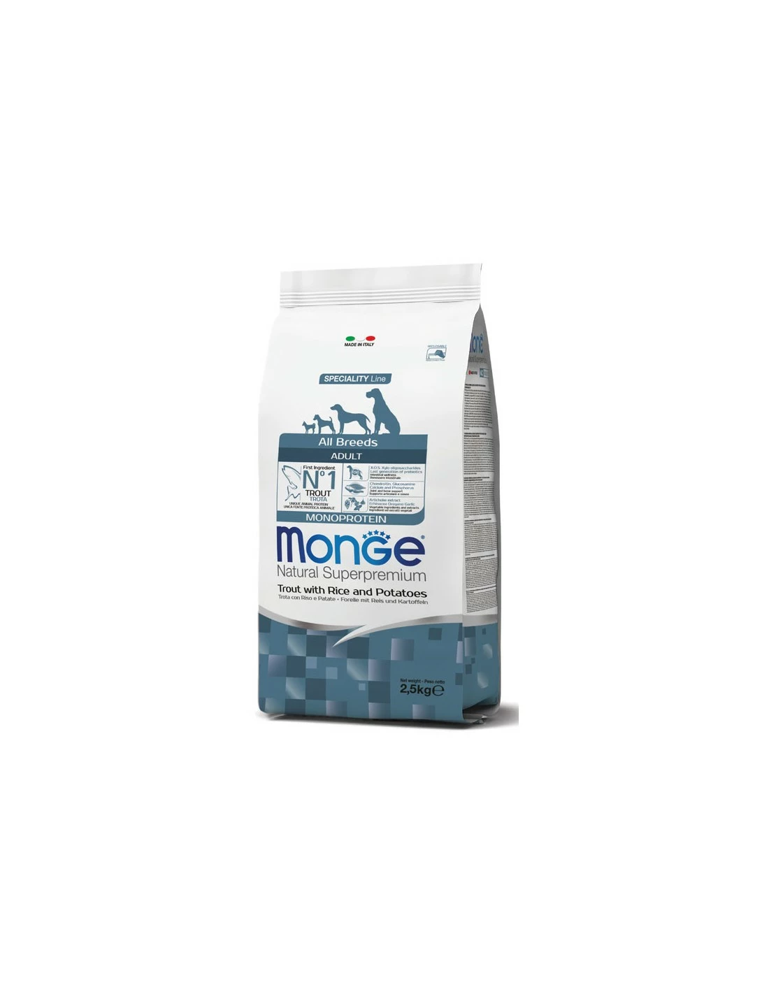 Monge Monoprotein alla Trota è un’alimento sviluppato pensando al benessere del tuo cane, grazie alla presenza di sostanze nutritive di qualità , frutto della ricerca Made in Italy. La trota rappresenta il primo ingrediente, arricchita con prebiotici di ultima generazione xilo-oligosaccaridi (XOS), per il supporto del benessere intestinale. La formulazione contiene inoltre ingredienti ed estratti vegetali, come la radice di echinacea, origano, aglio ed estratto di carciofo, e glucosamina e solfato di condroitina per il supporto delle articolazioni e delle ossa. Senza coloranti e conservanti artificiali aggiunti.