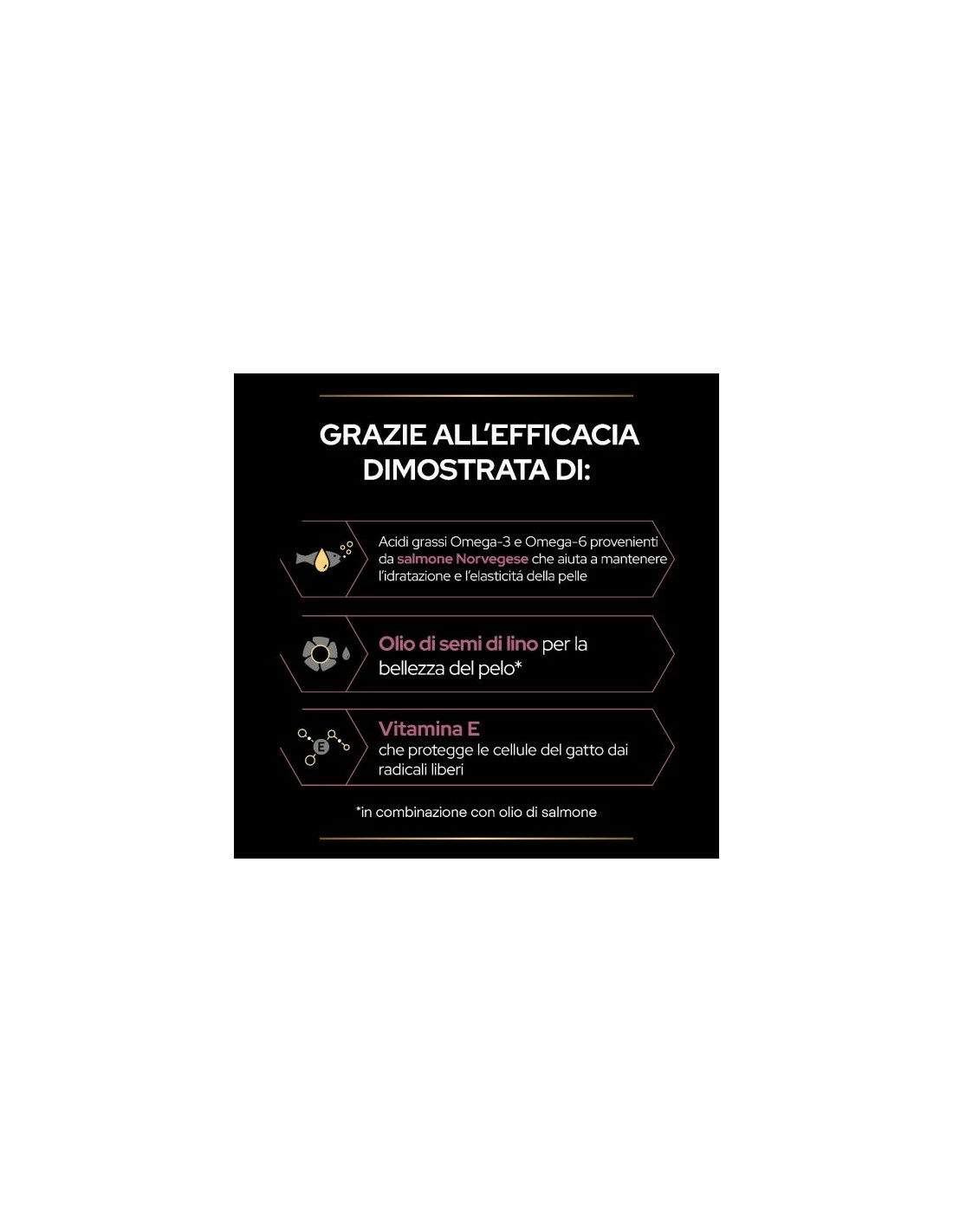 PRO PLAN Cat Supplement Skin & Coat+ contiene olio di semi di lino e olio di salmone norvegese, che aiuta a mantenere l’idratazione e l’elasticità della pelle, entrambi fonti di acidi grassi Omega 3 & 6. Inoltre, fornisce all’organismo del tuo micio vitamina E, un antiossidante che svolge un ruolo importante nella protezione delle cellule dai radicali liberi.