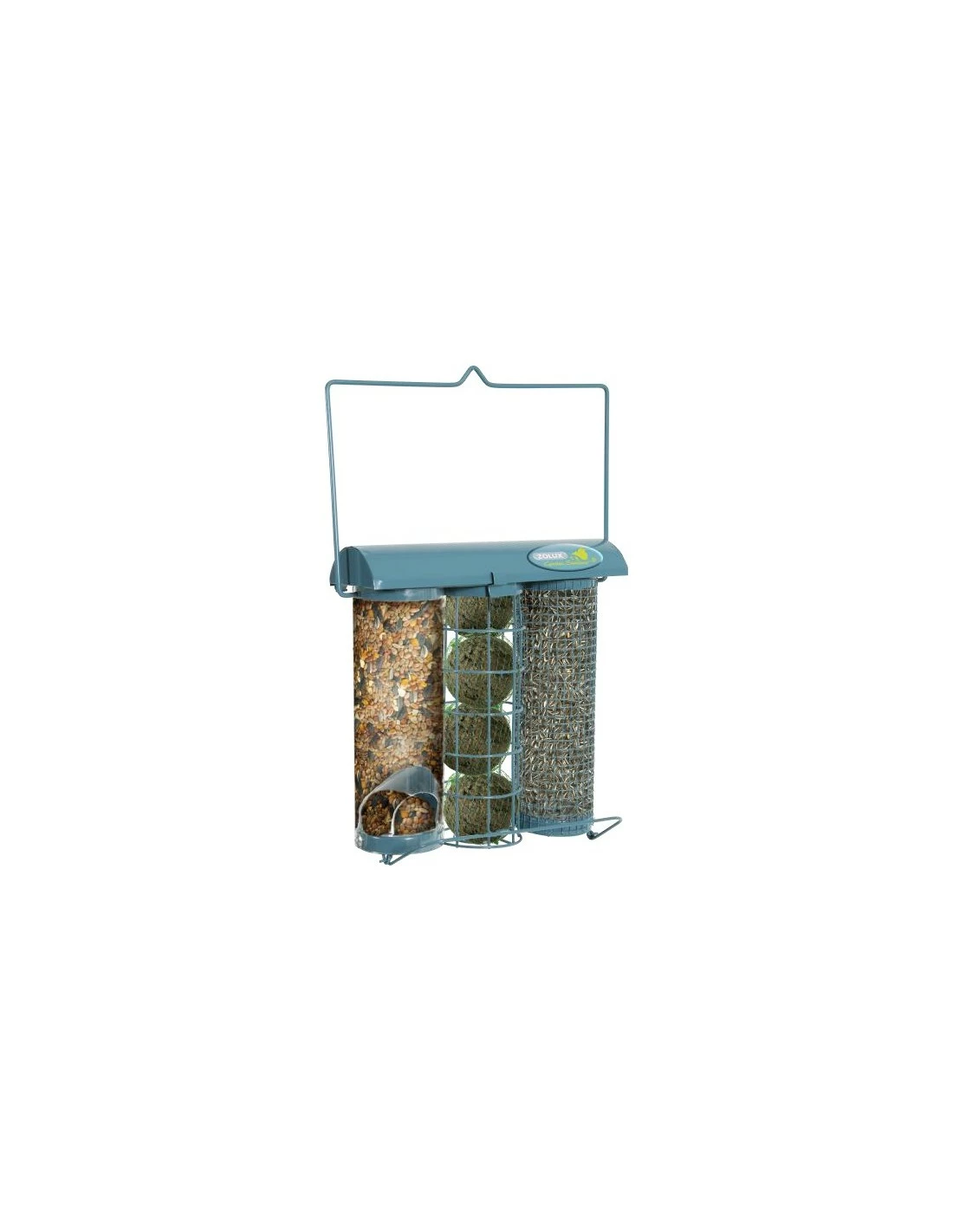 Questa mangiatoia a tre sistemi unisce tre possibilità di utilizzo in un unico prodotto: è infatti composta da un contenitore per pastoncino e piccoli semi, un contenitore per le palline di grasso e un contenitore per i grandi semi di girasole e le arachidi.